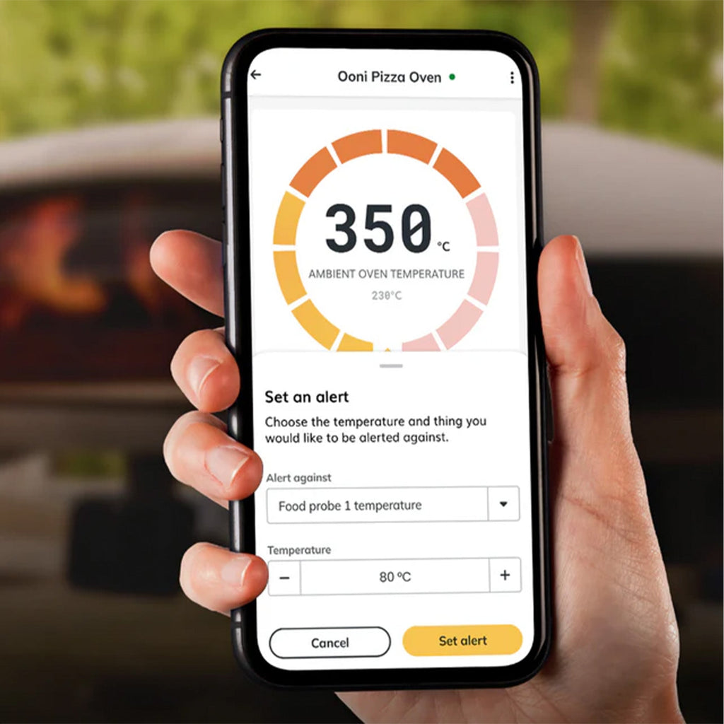 Stay in control with the Bluetooth-enabled Ooni Connect™ Digital Temperature Hub, which displays real-time oven temperatures and food probe readings directly on its front panel or in the Ooni app. Log cooking sessions, set alerts, and spend more time enjoying perfect pizzas with friends and family — not watching the fire.